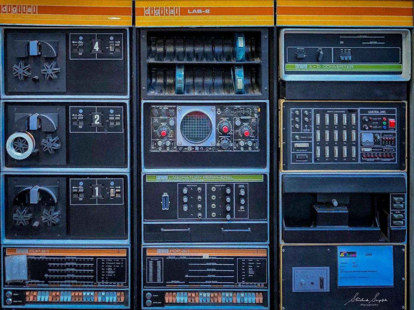 An exhibition showcasing the evolution of computers in chronological order with a timeline starting from the 1950s. It starts with huge corporate computers like DEC PDP and punch card systems, followed by well-known home computers such as the Commodore 64, Commodore Amiga, Atari ST, Sinclair ZX Spectrum, Apple II, and MSX, followed by more modern personal computers. The Scholten computer which’s the only copy that Professor Scholten made in the early 1960s and the first Apple computer are some of the showstoppers.