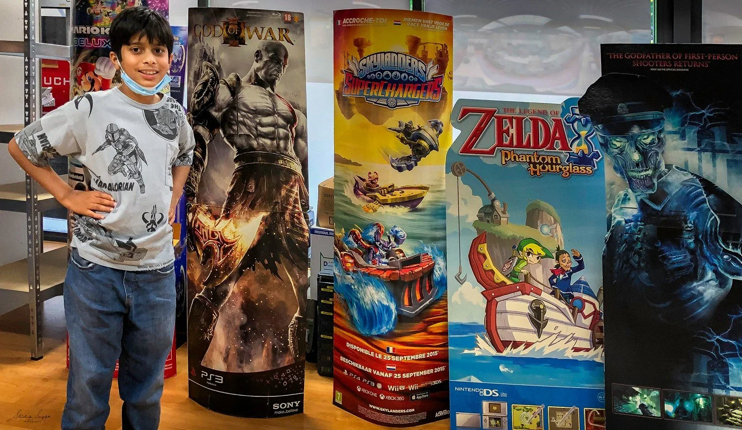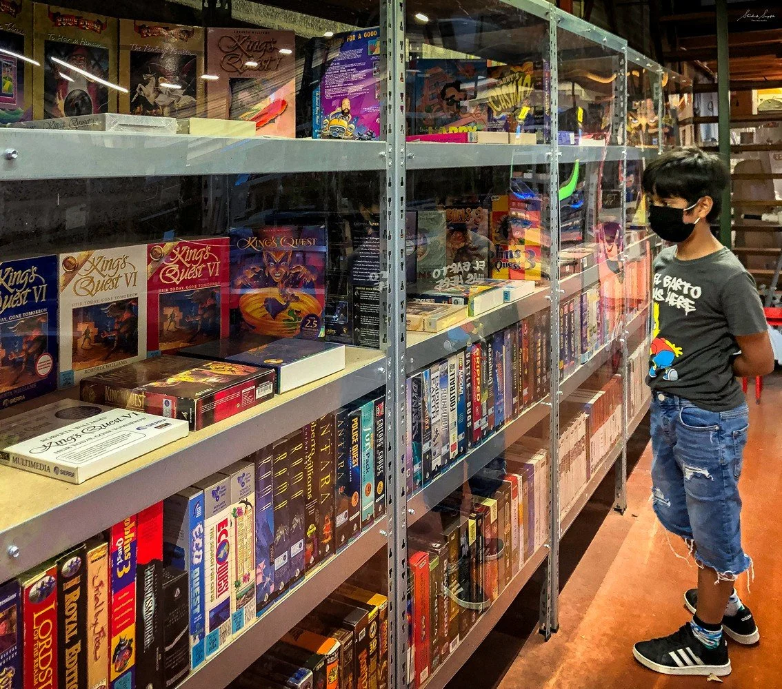 Boxed video game floppies, CDs, DVDs, merchandise products, and collector items on display