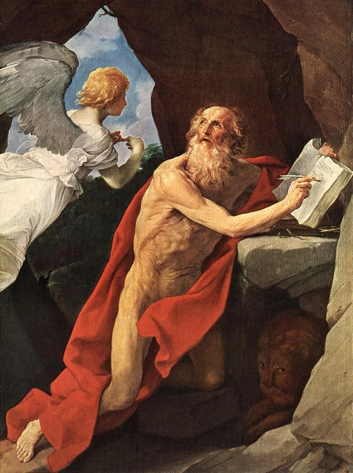 Painting of St. Jerome translating Old Testament from Hebrew to Latin (Vulgate Bible) while an Angel appears by Guido Reni (1635), Kunsthistorisches Museum, Vienna (Austria)