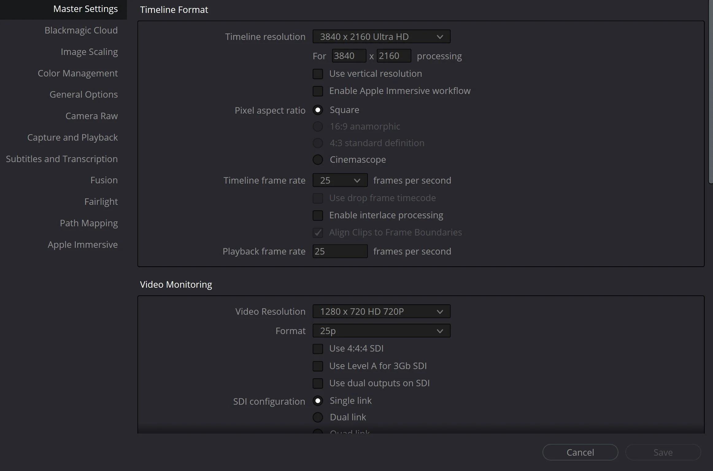 Note: You can save these settings by clicking on the Settings cogwheel icon -> 3 dots on the top right corner on the Settings window -> Save Current Settings as Preset -> name the Preset ‘4K 25 FPS’ -> OK. After that whenever you want to load these settings to one of your new projects, you can simply click on the Settings cogwheel icon again -> 3 dots on the top right corner on the Settings window -> ‘4K 25 FPS’ -> Load Preset